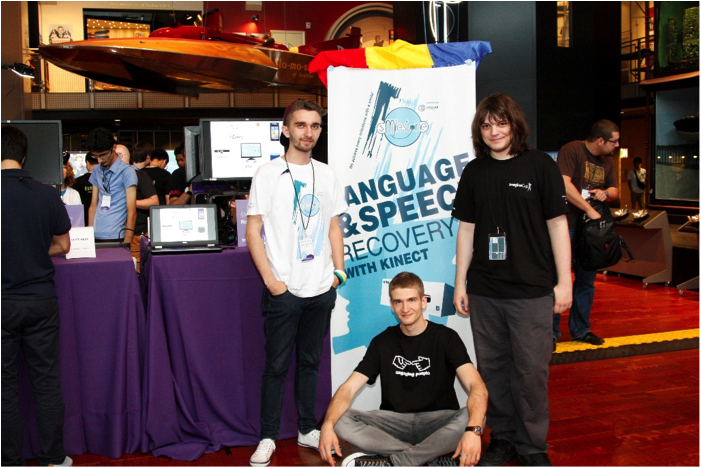 O altă echipă din Cluj a reprezentat România şi la finala de la Seattle din acest an. Echipa se numeşte Smile Technology (SMT) şi este formată din trei studenţi ai secţiei Informatică Engleză a Facultăţii de Matematică şi Informatică a Universităţii Babeş-Bolyai: Bogdan Mursa, Rareş Urdea şi Bogdan Pop (în ordine în care apar în imaginea de mai jos) echipă pe care am avut plăcerea să o coordonez. Soluţia propusă de ei, Smilestone, este o aplicaţie ce implementează cu ajutorul unui dispozitiv Kinect o serie de exerciţii utile în procesul de recuperare a limbajului pentru persoanele ce au pierdut capacitatea de a vorbi în urma unui atac cerebral.