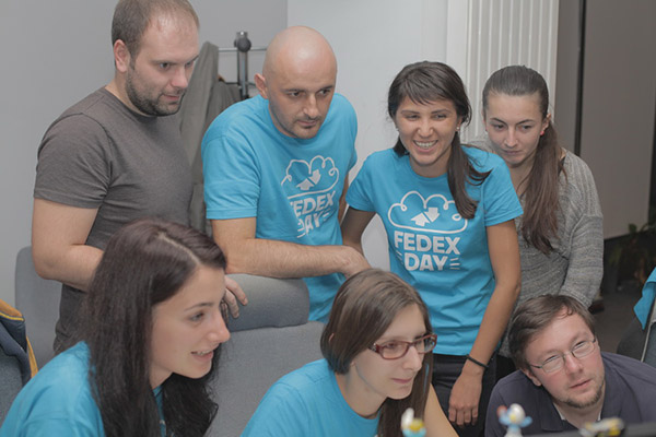 Cum arată lucrurile la FedEX Day? În fiecare an lookul evenimentului se schimbă dar constantă e ideea de "Build For Fun"- adică, ia cea mai năstrușnică idee care îți vine în mine și transpune-o într-un prototip funcțional. Anul trecut clădirea arăta ca un șantier, cu schele, ciocane, mortar, un furnicar de oameni toți preocupați să construiască ceva. Anul ăsta cum intri în firmă e plin de nori pufoși, care iau diverse forme. E similar cu ideile care plutesc în aer; multe dintre ele pot fi geniale, depinde ce formă le dai și în ce direcție le conduci. În preajma FedEx Day, oriunde te uiți vezi grupuri, grupulețe care fac planuri despre ce vor face la FedEx și ce nume de echipă să-și aleagă (Betmen, NOcotopus, Brilliant Beavers, Promo Chefs etc.). Dacă e aproape 14.30 simți cum tremură clădirea și apar 200 de fețe la care le sclipesc ochii - primim tricourile cool, FedEx Day branded. Unii le îmbracă imediat alții le împătură cu multă grijă să fie fără cusur pentru marele moment - sesiunea de demo. De la 15.00 încep ședințe de planning, stand up-uri, râsete și brusc toată lumea e pusă pe fapte; unii scriu cod, alții fac rost de resurse, alții testează, toată lumea e în priză. Vezi cum încet încet se întunecă și nu pleacă nimeni acasă. La 23.00 când par să se descarce bateriile apare Red Bull-ul, ciocolata și alte preparate "sănătoase". La ora 3.00 a.m. e încă lume în birou și deși nu-i ține nimeni acolo, totuși stau. A doua zi la micul dejun vezi cearcăne, dar adrenalina e în aer. În jurul prânzului tensiunea atinge cote tot mai ridicate. Ceva nu mai merge, nu mai terminăm, am stricat tot, ne-a expirat un certificat de securitate, toate legile lui Murphy sunt adevărate. La ora 15.00, ca la examen vezi că a expirat timpul ,dar tot mai ai de scris o frază; mai trebuie o linie de cod, un ultim test, ceva, un pic, prea târziu. Pe monitor apare un pop-up cu timpul a expirat, apucă-te de împachetat, așteptăm livrarea. Și dacă poți ignora asta nu poți ignora portavocea care sună în tot biroul și îți amintește ce e timpul să faci livrarea.