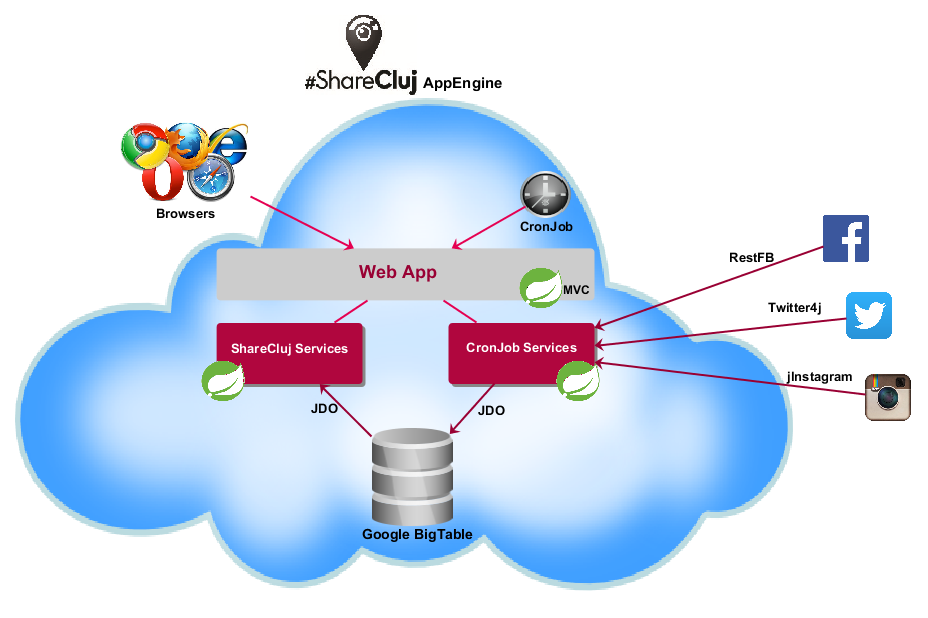 Chiar dacă tentația e mare să experimentezi cu tehnologii noi când ai pe mână un proiect green field, ne-am decis rapid să folosim ca tehnologie de bază Java și framework-uri cunoscute: Spring MVC, JDO. Costul proiectului trebuia să fie cât mai mic posibil, deci nu se putea pune problema închirierii unui server, așa că am ales ceva ce nu am mai folosit până atunci: Google AppEngine cu o quota suficient de mare pentru stocare de date, operațiuni pe baza de date, ore de instanță, indecși, deploy-uri, etc. . AppEngine s-a dovedit a fi cel mai potrivit pentru proiect. Integrarea cu rețelele sociale urma să fie făcută folosind API-ul expus de fiecare prin scrierea de clienți care să aducă metadata post-urilor și să o stocheze în baza de date.