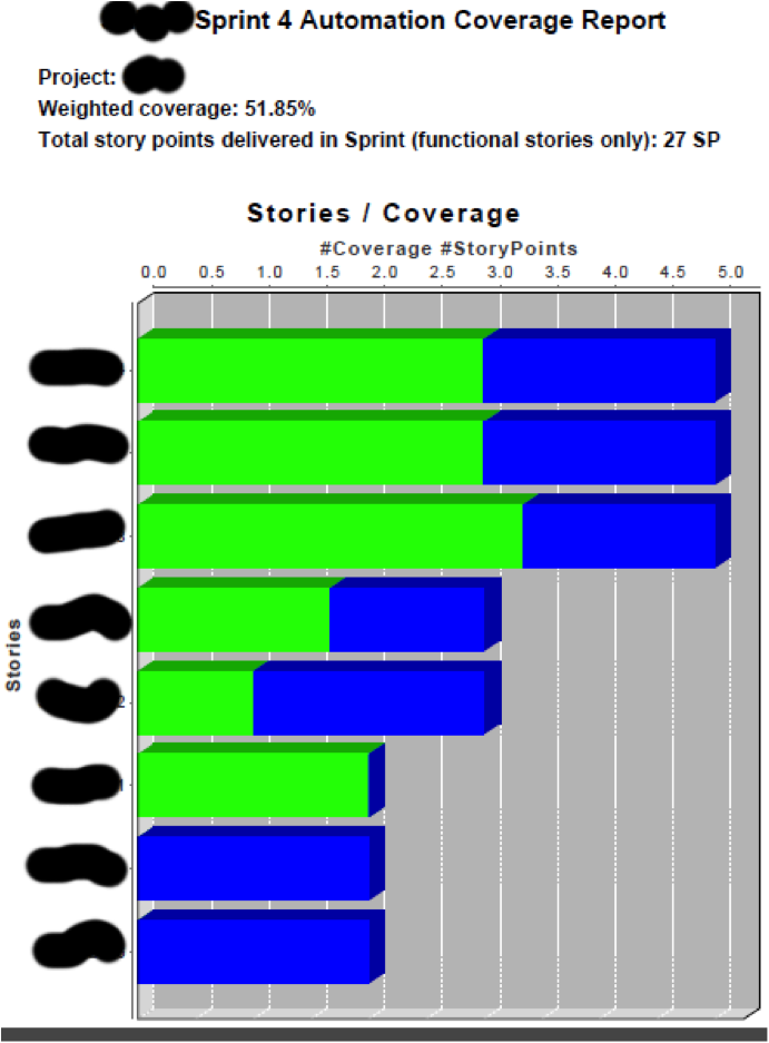 Raportul generat va prezenta grafic cât de mult dintr-un user story este acoperit de testele de Selenium. Partea verde va spune valoare exactă a procentului de acoperire (lungimea totală a unei bare reprezintă numărul total de story points). Partea albastră nu are o conotație negativă (motiv pentru care nu am ales roșul). Spune doar ca _Product Onwer-ul este confortabil cu faptul că anumite scenarii nu vor fi automatizate.