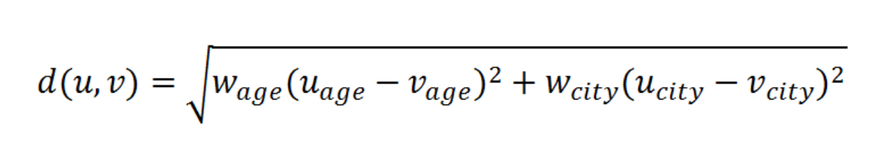 unde u și v sunt doi vectori, reprezentând 2 puncte (elemente), iar fiecare vector este compus din 2 valori, vârstă și oraș (uage, ucity) ; iar uage și ucity reprezintă greutățile celor 2 atribute, vârstă și oraș.