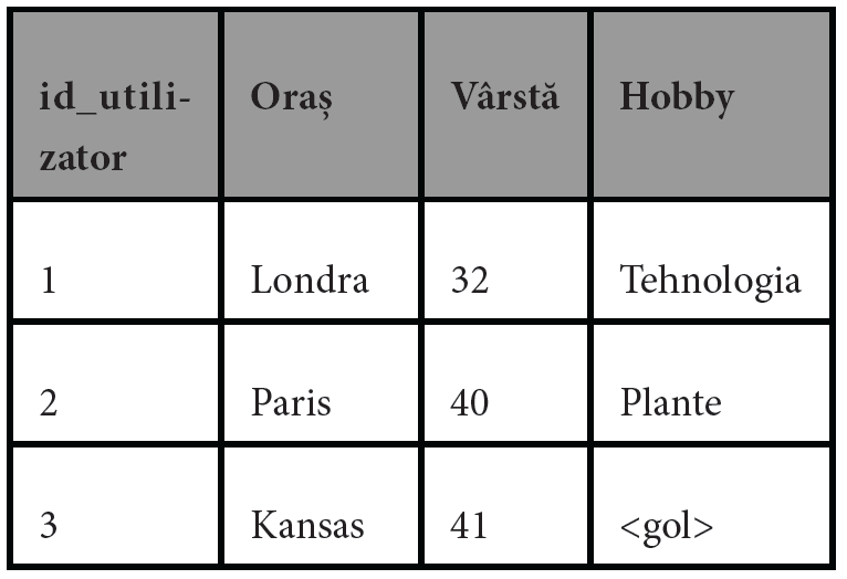 Dorim să oferim utilizatorilor similari conținut asemănător despre hobby-uri (ideea fiind că oamenii asemănători preferă lucruri similare). Astfel, prin transformarea datelor de intrare în date numerice (în mod manual sau automat) ca în tabelul următor: