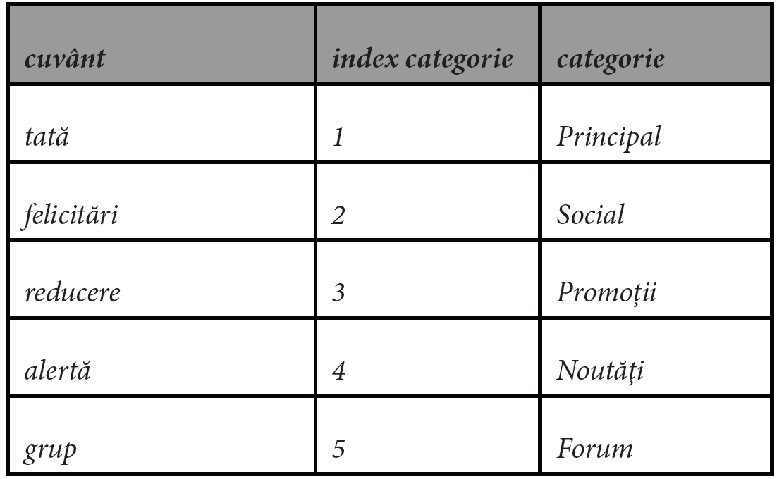 Folosind dicționarul de mai sus vom reprezenta următorul e-mail: