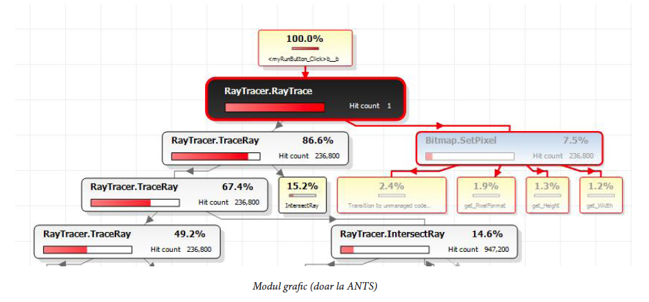 Notă: La dotTrace acest procentaj apare intotdeauna în afisarea arborescenta. În cazul profiler-ului de la ANTS exista o coloana care se numeste "Time with children" iar valorile ei pot fi exprimate la alegere în pro-cent, milisecunde sau secunde.