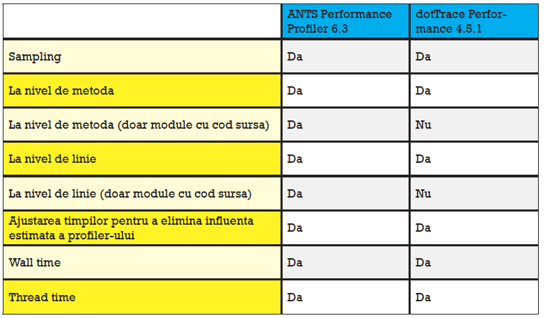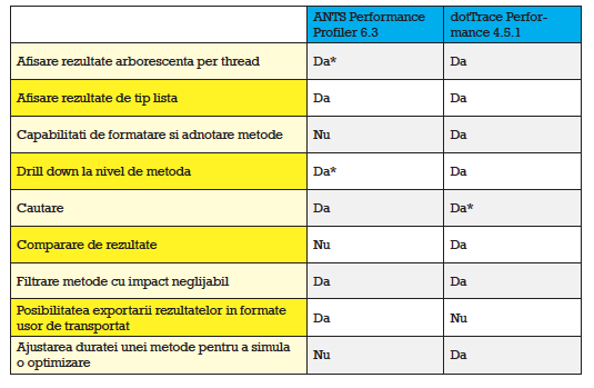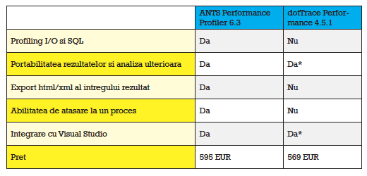 Doar dotTrace Performance 4.5.1 oferă posibilitatea de a compara rezultatele obținute în două sesiuni de profiling diferite prin funcţia de comparare a două snapshot-uri.
