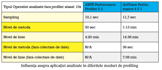 Ambele profiler-e influențează aplicaţia pe care o analizează în funcţie de modul de profiling folosit atat în termeni de performanţa cat şi de memorie.