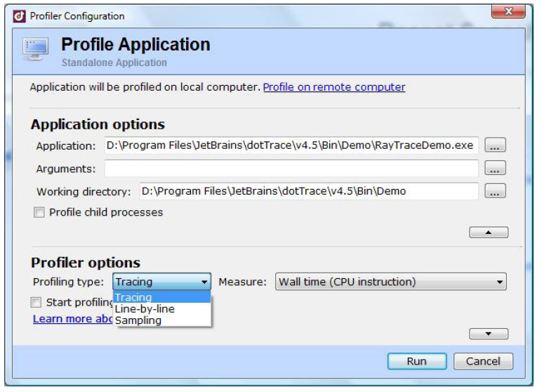 Fiecare oferă posibilitatea de a alege tipul aplicaţiei de analizat (standalone, sil-verlight, web etc.) şi optiunile legate de nivelul de detaliu al datelor colectate (la nivel de linie, metoda sau sampling).