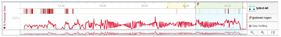 Selectarea unei ferestre pe timeline va actu-aliza datele colectate din fereastra de analiza pe intervalul determinat de fereastra. Fere-strele se pot construi astfel încât să cuprin-da o anumita operaţie, un spike CPU sau intreaga fereastra.