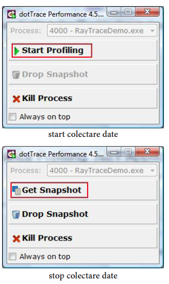 Cele două applicații au moduri diferite pen-tru a obtine datele de profiling între două momente de timp: ANTS Performance Pro-filer 6.3 are notiunea de timeline (linie a tim-pului), iar dotTrace Performance folosește noțiunea de snapshot.
