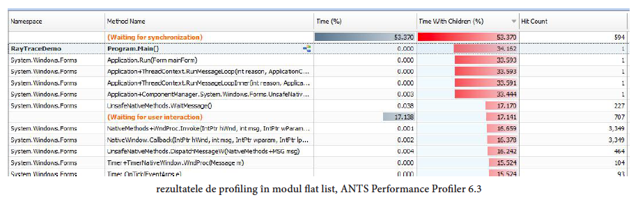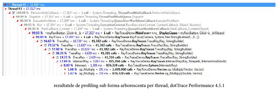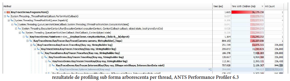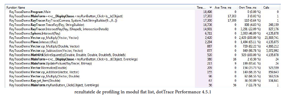 În tabelul din dreapta se gasesc măsuratori de performanţa facute asupra unei aplicaţii de test (aplicaţia Demo din kitul de dotTrace Performance 4.5.1)
