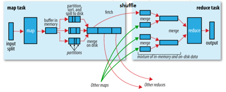 Faza de shuffle înseamnă toate procesele din punctul în care functia map produce rezultate până unde funcția de reducerea le consumă. Cu alte cuvinte, faza de shuffle implică sortare, unire și copierea datelor între map și reduce.