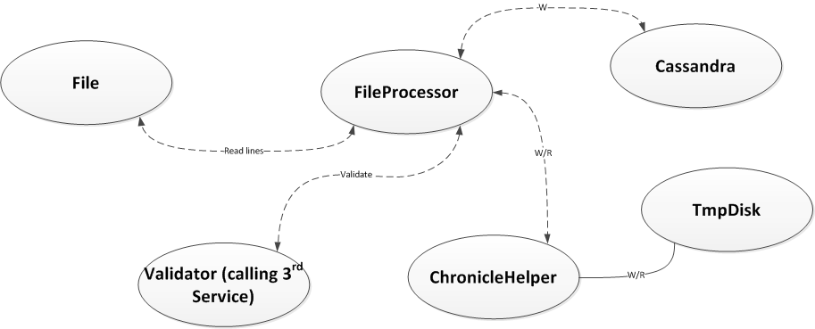 Dacă adaug ca procesarea să fie o acțiune de tipul totul-sau-nimic, unde avem proces de validare pentru fiecare linie în parte, contorizări ale lor, alte detalii din antet sau subsoluri chiar și grupuri de entități, adică grupuri de linii care de fapt reprezintă o singură entitate. Apoi, dacă fișierul e validat cu cerințele specifice fiecărei funcționalități, salvăm entitățile create pentru fiecare linie, sau grup de linii. Cu noua cerință observăm că ideea notată cu 1, nu ne mai ajută pentru că mai întâi trebuie să validăm fișierul, iar dacă acesta e valid, atunci să salvăm datele create pe baza lui. Salvarea pe heap a datelor cu dorința de a le persista la final reprezintă o soluție pentru fișierele mici - dar totuși să nu uităm că într-o aplicație "multitenancy" resursele fizice trebuie atent distribuite - astfel că memorarea lor temporară poate cauza OOME (JVM-ul rămâne fără resurse, ceea ce cauzează ca aplicația să fie oprită) pentru fișierele mai mari (de ex. > 500 MB).