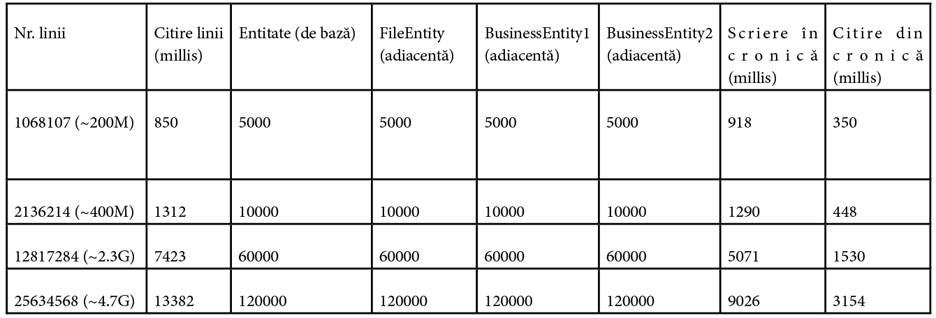 După cum se poate observa,timpul necesar pentru scrierea și citirea din cronică (memory-mapped file) durează aproximativ cât citirea fișierului. Așadar, dacă optați să citiți fișierul încă o dată (după validare) și să folosiți chronicle, serializarea și deserializarea obiectelor vin fără alt cost, întrucât timpii de mai sus includ acest lucru. În plus, a durat doar două ore până am avut capacitatea să salvam entitățile în cronică, deoarece API-ul e foarte simplu de utilizat și înțeles.