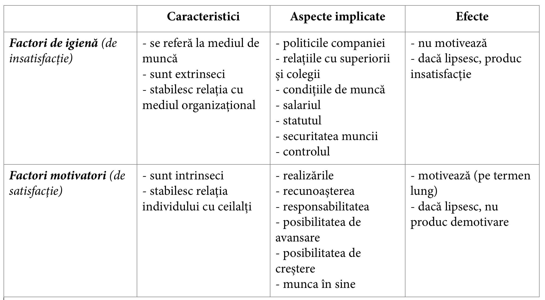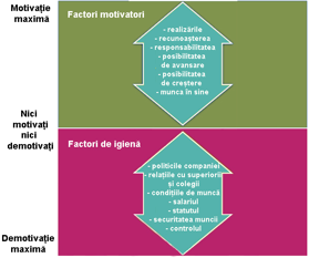 Studiul realizat de Herzberg (1959) a relevat faptul că factorii care contribuie cu adevărat la creșterea motivației sunt: responsabilitatea, posibilitatea de avansare, dezvoltarea, realizările, recunoașterea. Totuși, lipsa lor nu produce insatisfacție. Unul dintre cele mai importante lucruri de reținut este că: lipsa factorilor de igienă produce insatisfacție; prezența lor, însă, asigură un nivel mediu de implicare, însă nu generează motivație.