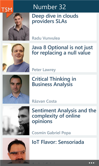 Inițiativa unei aplicații TSM pentru Windows Phone a luat naștere acum mai bine de un an, în cadrul centrului de competență 3Pillar Global, ca mod de explorare și a dobândirii de cunoștințe în ce privește platforma Microsoft pentru mobile. Proiectul a continuat ulterior cu multă dedicare din inițiativa proprie a celor implicați: Cosmin Jeler, autorul prezentului articol, responsabil de partea de dezvoltare, Robin Molnar axat asupra părții de asigurare a calității, Dan Hădărău pentru suportul acordat pe partea de design și server-side iar Ovidiu Mățan project manager / product owner.