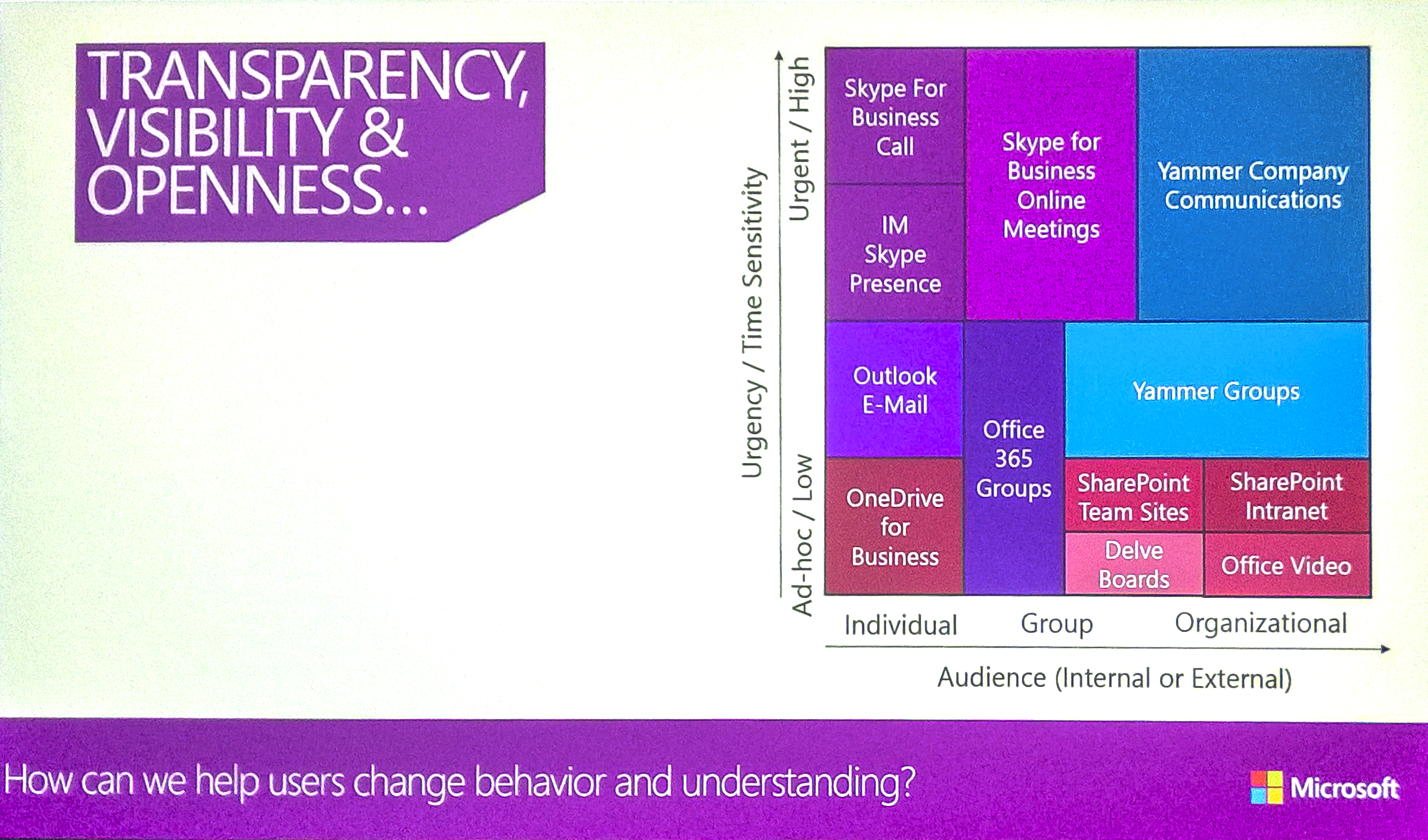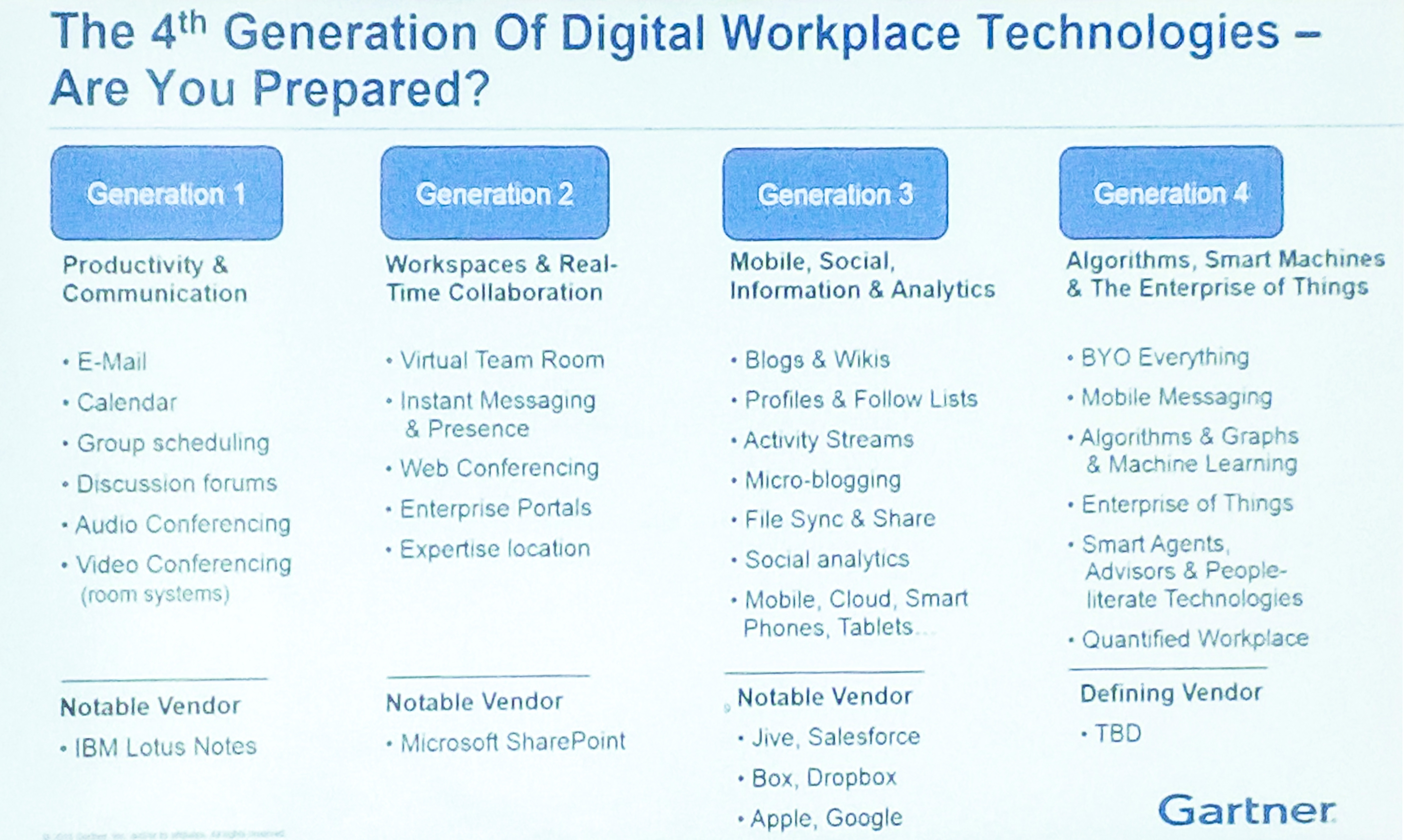 Microsoft a început cu Outlook (1992), SharePoint (2001), One Note (2003), Live Communications Server (2003) - numit Lync mai târziu și, recent, redenumit Skype for Business, OneDrive (2008), Skype (achiziționat în 2011), Office 365 (2011), Yammer (achiziționat în 2012) și Delve (2014). Ultimul pare să se integreze în a patra generație de tehnologii, așa cum a identificat Gartner (foto).