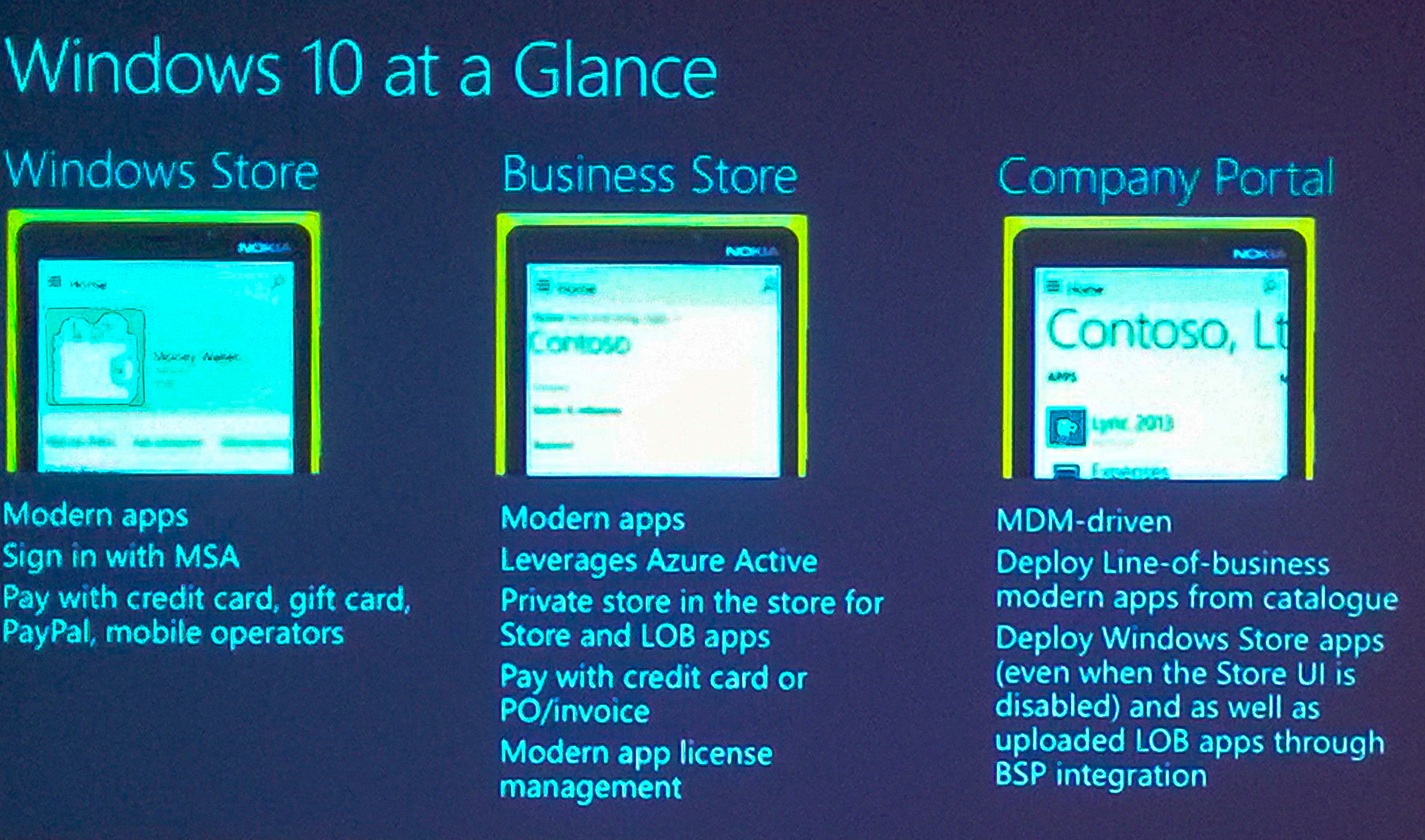 Până la sfârșitul acestui an, adițional Windows Store, companiile vor putea crea propriul lor Business Store sau Company Portal unde pot descărca aplicații din Public Store pentru utilizare internă și/sau publică și gestiona aplicațiile lor LOB (foto).