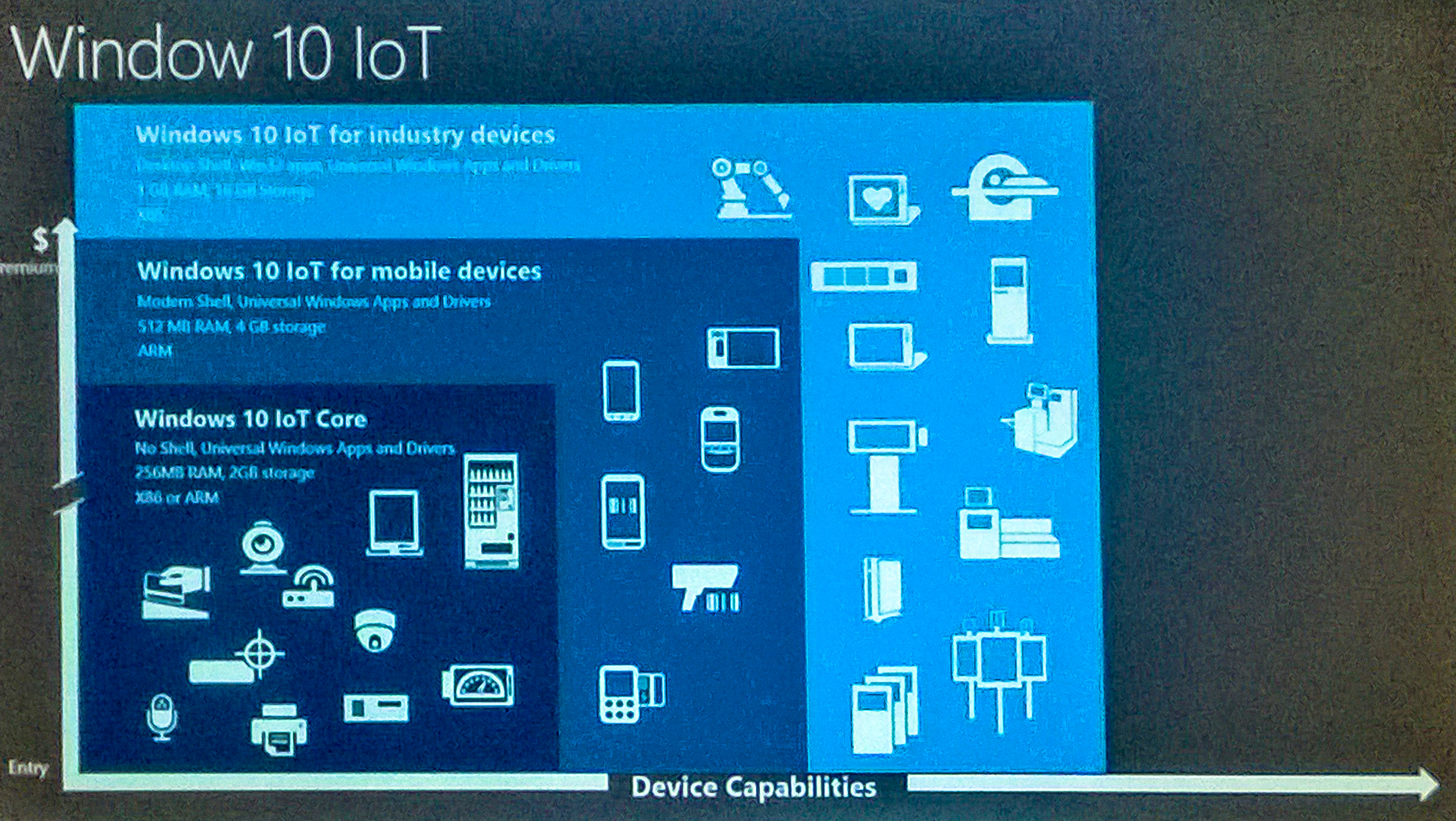 Majoritatea oamenilor au auzit deja de IoT sau au dezvoltat aplicații pentru IoT. Pe măsură ce devine din ce în ce mai tangibil și Microsoft avansează în această direcție. De exemplu, se va putea rula Windows 10 pe orice device care are putere minimă de computing-Microsoft având deja trei versiuni diferite ale sistemului său de operare-acoperind industry devices, device-uri mobile și chiar device-uri mai mici care pot să ruleze Windows IoT gratuit (foto).