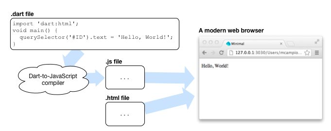 dart2js - compilatorul Dart-to-JavaScript, optimizat cu tree-shaking, minificare opțională, inferența tipurilor, ca la sfârșitul dezvoltării, aplicația să fie lansată cu ușurință în oricare alt browser decât Dartium. În cazul în care aveam nevoie de debugging, ne stă la dispoziție maparea surselor, adică a codului dart, chiar și în Mozilla sau Internet Explorer;