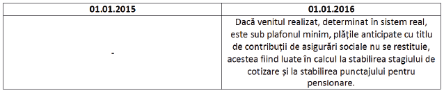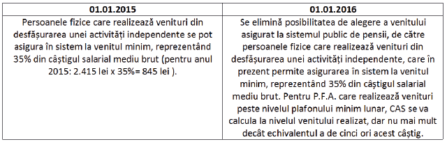 În prezent, pe lângă taxele menționate ca fiind obligatorii în cazul exemplului avut în vedere (impozit pe venit și C.A.S.S.), dacă P.F.A. nu are și un contract de muncă în calitate de salariat, datorează și contribuția la pensii (C.A.S.). Astfel, pentru pensii, contribuția este de 26,3% din venitul declarat, adică venitul pentru care dorește persoana respectivă să se asigure. Potrivit reglementărilor, acest venit nu poate fi mai mic de 35% din câștigul salarial mediu brut utilizat la fundamentarea bugetului asigurărilor sociale de stat, dar nici mai mare de echivalentul a de cinci ori câștigul salarial mediu brut utilizat la fundamentarea bugetului asigurărilor sociale de stat.