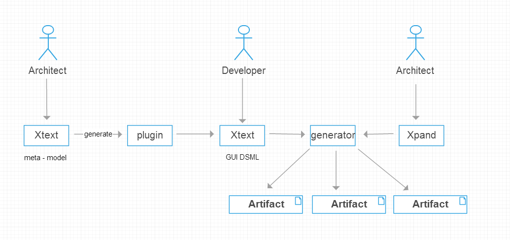 Xtext oferă un mod simplu de proiectare a unui limbaj specific domeniului. După ce arhitectul descrie gramatica folosită de către limbajul specific domeniului, xtext va genera un parser. Acest parser va fi folosit în implementarea descrierii Modelului Conceptual. Programatorul va descrie modelul conceptual în fișierele DSML, folosindu-se de parser-ul generat, concentrându-se numai asupra ceea ce este esențial pentru businessul soluției și nu asupra implementării.