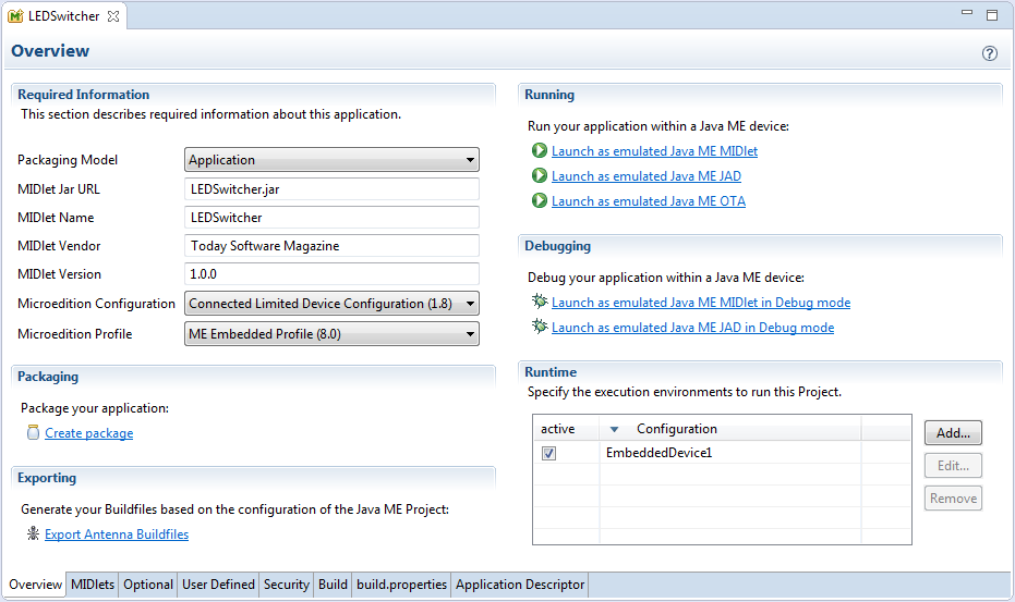 Revenind la paşii pe care trebuie să-i urmăm pentru a crea un astfel de proiect cu Eclipse şi MTJ, introducem în câmpul Project name numele LEDSwitcher, întrucât dorim să realizăm o aplicaţie care să deschidă şi să închidă un LED (Light-emitting diode), o dată la câteva secunde. Aceeaşi fereastră ne permite să dăm un alt nume fişierului JAD (Java Application Descriptor) şi să facem alte configurări legate de proiectul Eclipse. O dată ce am dat un nume proiectului nostru, mediul de dezvoltare ne avertizează că trebuie să alegem cel puţin o configuraţie pe care va fi rulată aplicaţia. Astfel, apăsăm butonul Add... din partea mediană a ferestrei şi ni se prezintă un alt dialog, cu titlul Add Configuration. Din meniul drop-down SDK alegem Oracle Java(TM) Platform Micro Edition SDK 8.1, iar Eclipse completează automat câmpurile Configuration Name şi Device cu valoarea EmbeddedDevice1. Apăsăm butonul Finish pentru a reveni la dialogul anterior. În acest moment putem apăsa Finish în dialogul New Java ME Project deoarece vom accepta valorile prestabilite propuse de IDE.
