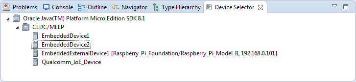 Dorim acum să testăm aplicaţia LEDSwitcher dar, pentru a face lucrurile mai interesante, vom încerca să o instalăm pe dispozitivul Raspberry PI. Aşa cum am văzut în articolul la care am făcut referire mai sus, trebuie să lansăm în execuţie mediul Java ME şi putem face acest lucru conectându-ne la plăcuţă prin SSH. O dată ce am făcut acest lucru rulând scriptul usertest.sh, înregistrăm dispozitivul cu ajutorul utilitarului Device Manager pe care ni-l pune la dispoziţie SDK-ul. Faptul că RPi este înregistrat se reflectă şi în view-ul Device Selector pe care perspectiva Java ME l-a deschis automat: