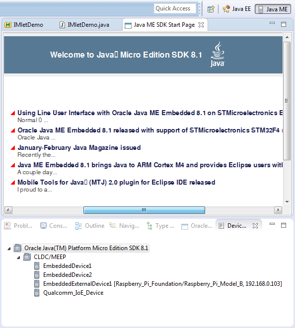 La momentul scrierii acestui material, Oracle oferă suport pentru două dintre cele mai cunoscute medii integrate de dezvoltare, Eclipse şi NetBeans. În acest articol vom discuta despre uneltele pe care le avem la dispoziţie folosind Eclipse, întrucât acest IDE se bucură de un număr mai mare de utilizatori, după cum arată unele surse. Astfel, similar articolului precedent, vom arăta care sunt pachetele software pe care trebuie să le instalăm şi cum putem crea o aplicaţie Java ME Embedded 8 cu Eclipse.