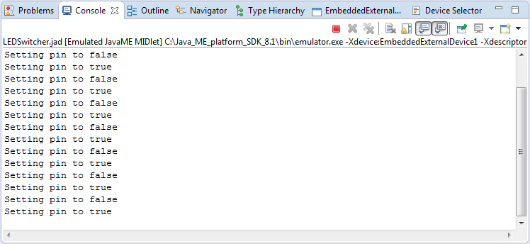 Salvăm modificările, care se reflectă în descriptorul aplicaţiei, LEDSwitcher.jad, şi lansăm aplicaţia în execuţie, folosind acelaşi mecanism. De data aceasta, observăm că aplicaţia rulează fără probleme.