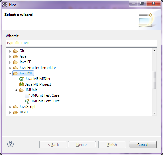 Eclipse împreună cu MTJ ne oferă câteva şabloane, care ne ajută să creăm mai rapid proiecte Java ME şi componente ale acestora. Acest lucru este demonstrat în figura următoare: