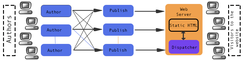 Serverul AEM poate să funcționeze în două moduri: author și publish. În modul author, instanța este utilizată pentru configurarea platformei și crearea de conținut, iar în modul publish instanta servește contentul către clienți. Numărul de instanțe de author și publish nu trebuie să fie corelate, iar AEM oferă un mecanism de replicare a datelor din author pe publish. Astfel încărcarea pe servere este distribuită, iar o activitate ridicată a editorilor va fi resimțită doar pe instantele author, fără a afecta performanța pentru clienti, întrucât aceștia se conectează la publish. Adobe mai oferă și un modul separat, numit Dispatcher, care are funcțiile de cache și load balancing. Responsabilitatea gestionării cache-ului este luată de pe umerii programatorilor, deoarece Dispatcher-ul invalidează cache-ul automat în momentul în care o pagină a fost modificată.