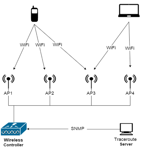 Primul pas a fost interogarea Wireless Lan Controller (WLC) prin intermediul protocolului SNMP și a căuta lista cu toate punctele de acces (AP) Wi-Fi prin intermediul metodei SNMP Walk pe cLApIfMacAddress. Pentru fiecare AP din listă, am extras toate dispozitivele conectate la el (bsnMobileStationMacAddr + Adresa MAC a AP-ului în sistem zecimal) și puterea semnalului (Received Signal Strength Indicator - RSSI) (bsnMobileStationRssiData + Adresa MAC a dispozitivului în sistem zecimal + Adresa MAC a AP-ului în sistem zecimal). Se pot interoga foarte multe informații despre dispozitive (IP, VLAN, metoda de criptare șamd), dar noi am mers strict pe variabilele expuse mai sus pentru a ne atinge scopul.