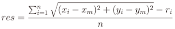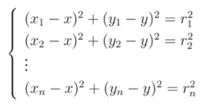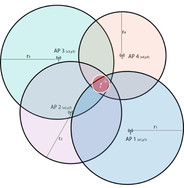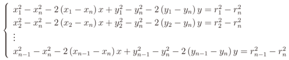 unde, n este numărul de AP care recepționează semnal de la dispozitiv (valoarea RSSI), D = (X,Y) este poziția dispozitivului, APi = (Xi, Yi) pozițiile AP-urilor, și Ri este distanța măsurată dintre AP și dispozitiv. Este un sistem non linear, dar liniarizarea este posibilă prin substragerea celei de-a "i"-a ecuație din toate cele n-1 ecuații: