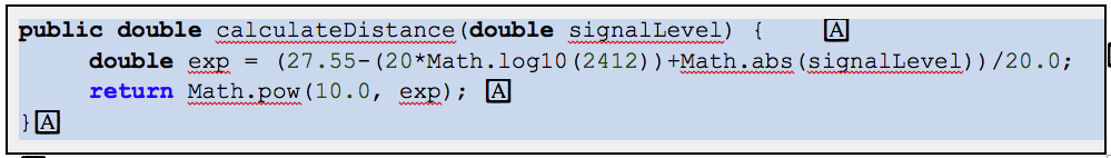 Pentru a calcula distanța în metri dintre AP și dispozitiv avem nevoie de doi parametri, și anume: puterea semnalului și frecvența semnalului. Formula de calcul este forma transformată a Free Space Path Loss (FSPL):