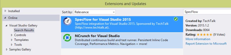 Integrarea SpecFlow cu Visual Studio este simplă și constă în doi pași. Primul pas este să instalați Integrated Development Environmentul utilizând opțiunea Extensions and Updates din meniu, după cum puteți vedea pe imaginea de mai jos:
