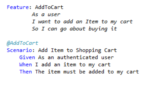 Pentru a defini comportamentul sistemului, crearea unui fișier Feature este obligatoriu. Fișierul acesta conține privirea de ansamblu asupra funcționalității din user story și scenariile scrise în limbaj Gherkin. Este de preferat să avem echipe compuse din oameni cu diferite roluri în procesul de dezvoltare care să lucreze la crearea fișierului de caracteristici, deoarece aceasta duce la îmbunătățirea integrării și comunicării în echipă și reduce durata unui ciclu de dezvoltare pentru funcționalități noi. Un fișier de caracteristici de obicei conține o listă de scenarii, care începe cu cuvântul Scenariu (Scenario). Folosind etichetarea, se pot grupa laolaltă caracteristici și scenarii și se pot reutiliza părți din scenariile deja definite. Fiecare scenariu este definit printr-o listă de pași, care trebuie să înceapă cu unul dintre cuvintele cheie: Given (Dat), When (Când), Then (Apoi), But (Dar) sau And (Și).