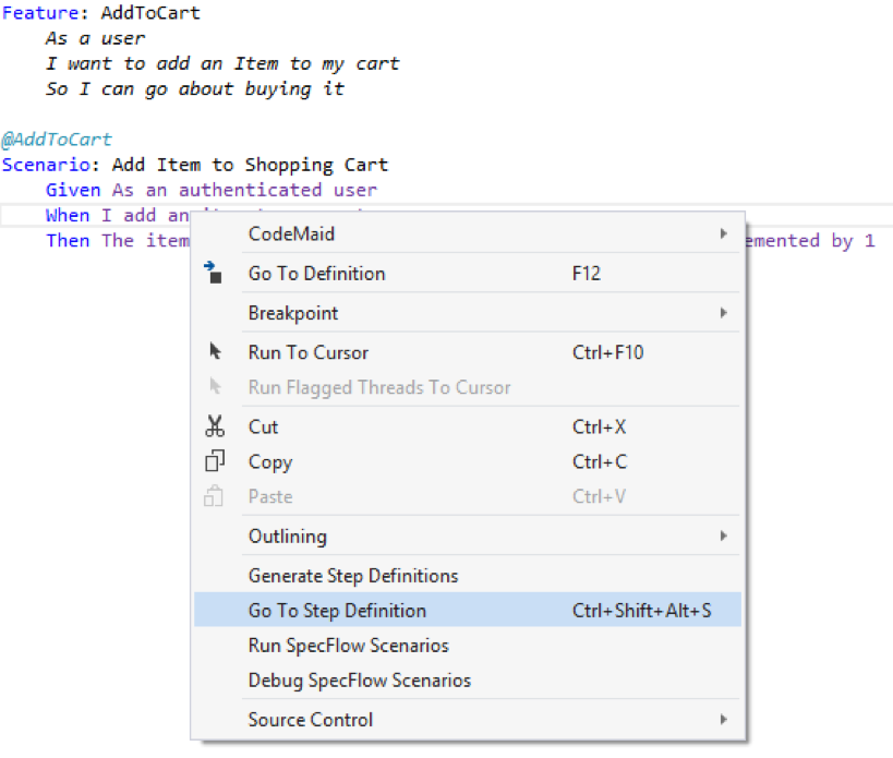 Traducerea liniilor în etape este efectuată prin click dreapta în fișierul de caracteristici și selectarea "Generate Step definition". Un ghid va crea scheletul fișierului pentru etape.