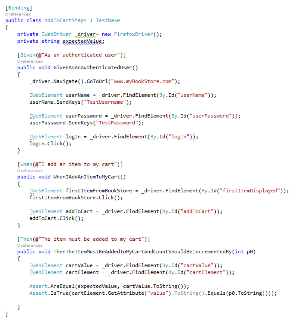 Ca și oricare alte teste din familia Cucumber, un test de validare SpecFlow necesită: un fișier de caracteristici (feature file), definirea pașilor și cod business.