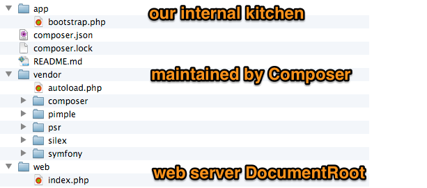 În lumea PHP micro-frameworkurile au devenit cetățeni de prim rang în urmă cu mult timp. Slim, Flight, Limonade, GluePHP, Phlyty sunt doar câteva exemple cunoscute. Noi vom întrebuința Silex, care are la bază componente ale mai popularului Symfony. Pentru a ne forma o idee cât de suplu e Silex, haideți să aruncăm o privire asupra containerului său de injectare a dependințelor (Pimple) și să vedem cum se compară cu cel de la Symfony (imaginea este preluată dintr-o prezentare a lui Igor Wiedler):