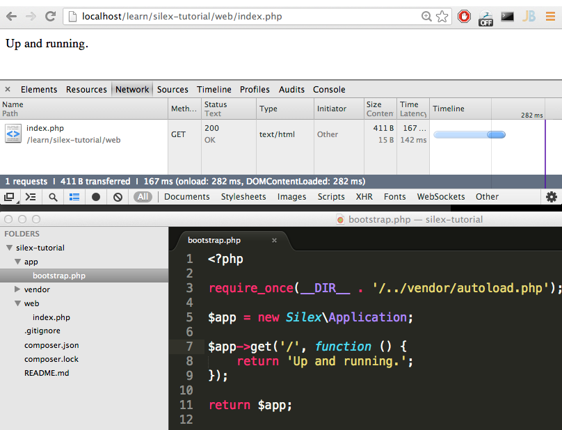 Fișierul de bootstrap defineste obiectul aplicației Silex și îl returnează. Conținutul fișierului accesibil public e foarte simplu, instanțiază acest obiect și îl rulează prin apelarea metodei run() a acestuia.