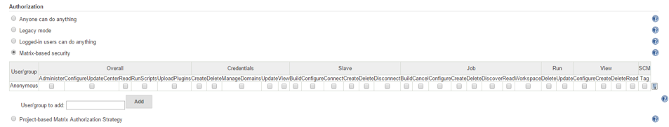 În această pagină avem mai multe opțiuni pentru securizare (Legacy mode, Logged-in users can do anything,  Matrix-based security,  Project-based Matrix Authorization Strategy). Cel mai folosit mod fiind Matrix-based security în care se setează drepturi pentru fiecare utilizator și pentru fiecare tip de task pe care acesta îl poate efectua.