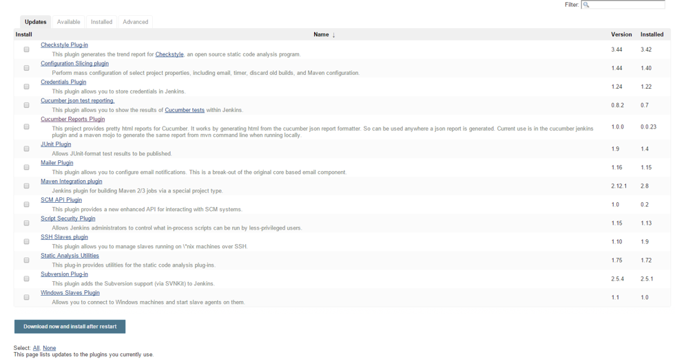 În Jenkins plugin-urile pot fi adăugate, șterse, actualizate prin „Manage Plugins” din „Manage Jenkins”. La instalare, Jenkins are un set minim de plugin-uri, însă pentru a te putea folosi eficient de Jenkins mai multe plugin-uri ar trebui instalate.