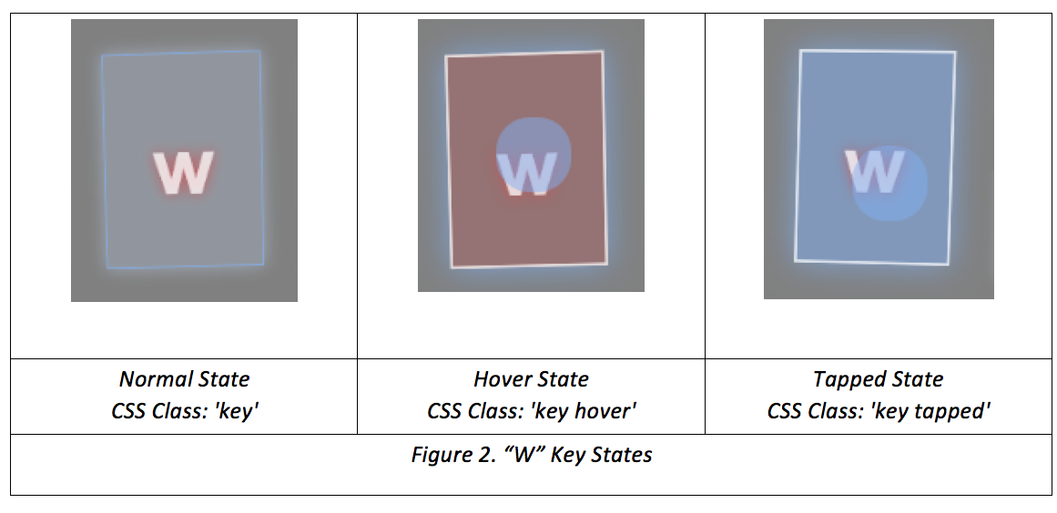 Următoarele figuri ilustrează stările unei taste - normal, hover și tapped. Toate aceste stări se realizează folosind reguli CSS applicate elementelor de HTML, transpuse în THREE.CSS3DObjects și randate prin CSS3DRENDERER