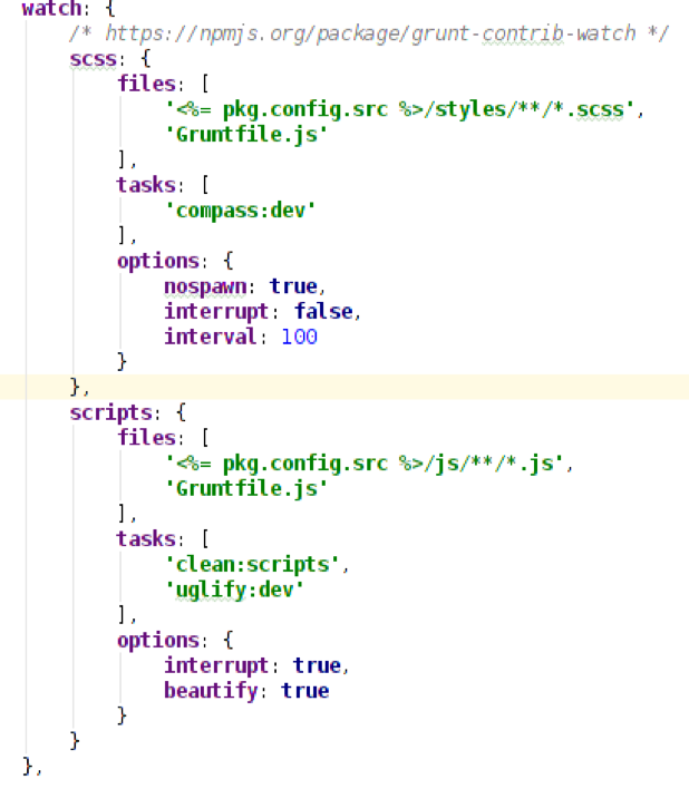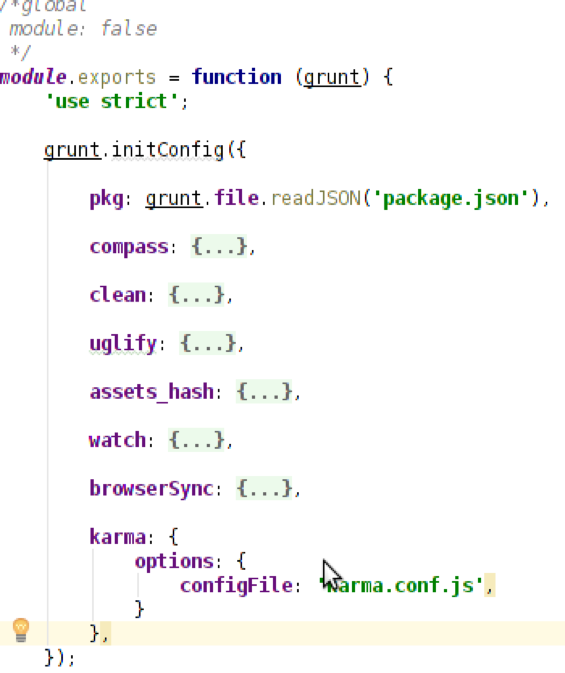 Odată ce avem acestea instalate putem să începem să ne construim fișierul Gruntfile.js, fișier care, de asemenea, este creat pe același nivel ca și fișierul package.json. Avem nevoie de acest fișier deoarece de fiecare dată când comanda grunt este rulată va lua în considerare acest fișier.
