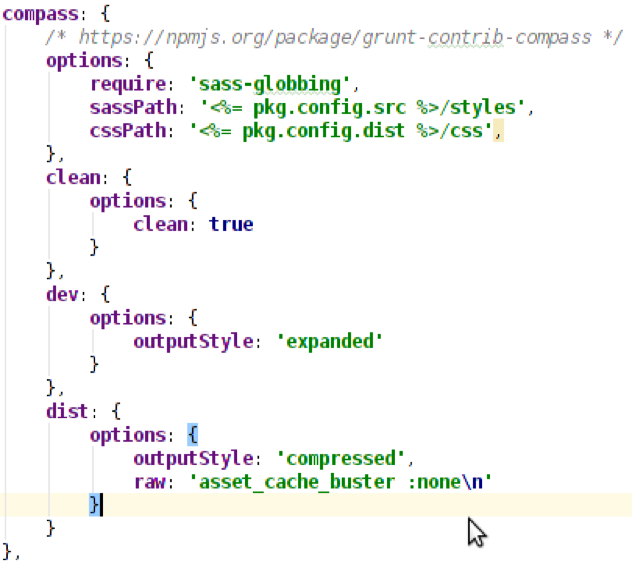 După ce s-a făcut load la task-urile inițiale, vom folosi task-ul compass pentru proiectul nostru. Dacă se va rula comanda grunt compass:dev vom vedea că în fișierul destinație scss vor fi concatenate toate fișierele sass folosite. Se va transforma apoi în format css cu format de afișare expandat. Pentru mediul de lucru în producție stilul este compact.