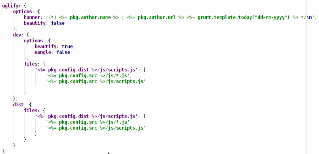 Pentru concatenarea fișierelor js am folosit task-ul uglify. Pentru mediul de lucru local am ales opțiunea ca după concatenarea fișierelor rezultatul să fie expandat, iar pentru mediul de lucru în producție să fie minified.