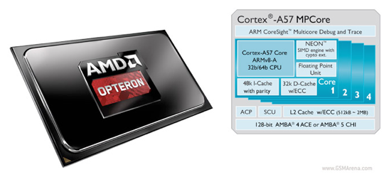 AMD a lansat primul său procesor ARM: Opteron A1100. Acesta va avea o versiune cu patru core-uri care va consuma 25W și una cu opt core-uri care va consuma 32W. Specificațiile sunt: Cortex A57 CPU cores, 1 MB cache L2 și 8MB cache L3, iar memoriile suportate sunt DDR3 și DDR4. Este un pas important pentru AMD care astfel intră pe piața serverelor ARM.