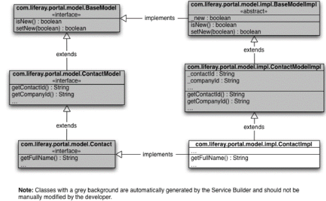Modul in care se generează o entitate, este destul de complex și nu este conceput decât pentru a face parte dintr-un API (asta pentru a avea capacitatea de a suporta bazele de date majore ca și MSSQL, PostgreSQL, MySQL șamd). Aici nu includem si layer-ul de srvicii, care mai adauga in API înca opt clase: (http://www.liferay.com/community/wiki/-/wiki/Main/Service+Builder)