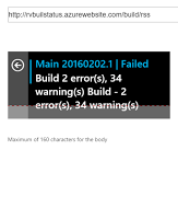 O soluție mai simplă este să expunem un RSS feed / o intrare RSS cu notificările de modificare a statusului construcției. De fiecare dată, când se modifică starea construcției, un conținut nou va fi disponibil pe Serverul RSS. Tile-ul care rulează pe band va detecta noul conținut și va înștiința utilizatorul.