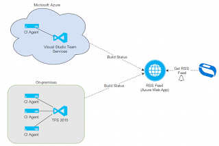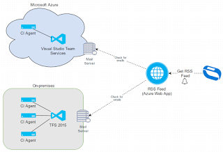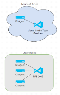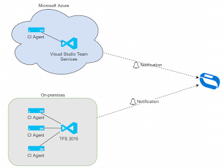 Ideea este simplă. Noi ne păstrăm codul sursă pe TFS Online (Visual Studio Online) și TFS 2015 la locație. Avem diferiți agenți de dezvoltare pe Azure și în rețeaua privată a companiei noastre (la locație) care construiesc soluția noastră, rulează teste pe unități, extrag diferiți parametri și pun în folosință aplicația în mod automat pe medii diferite. Scopul principal este să înștiințeze cât mai curând posibil echipa de dezvoltare de faptul că a picat construcția.